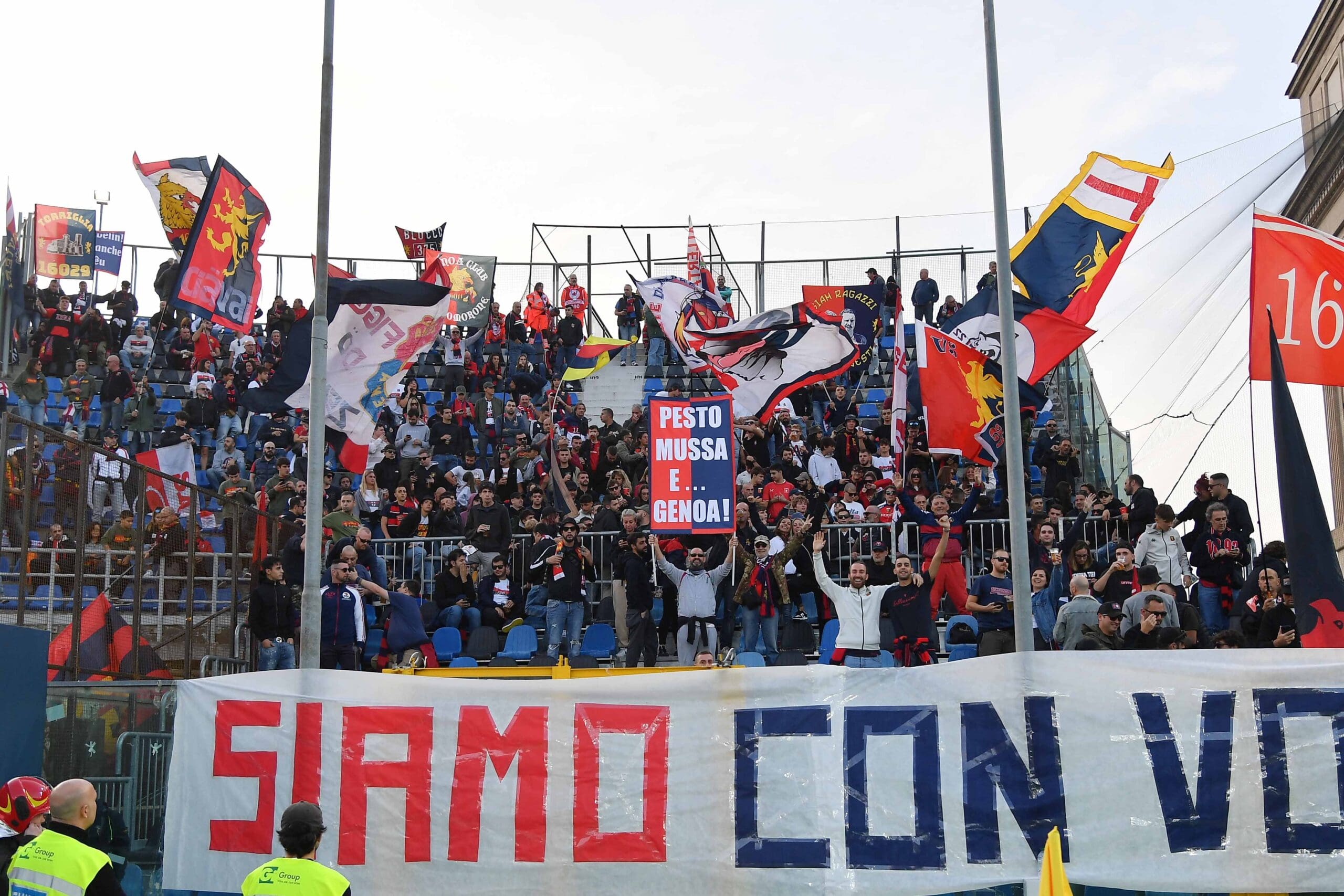 Lo striscione, alle cui spalle sventolavano bandiere e colori rossoblu, era rivolto ai tifosi raggiunti da misure cautelari di diversa forma per gli scontri post Genoa-Perugia dello scorso aprile. Per lo stesso motivo i primi cinque minuti della gara di Bergamo sono stati osservati in silenzio.