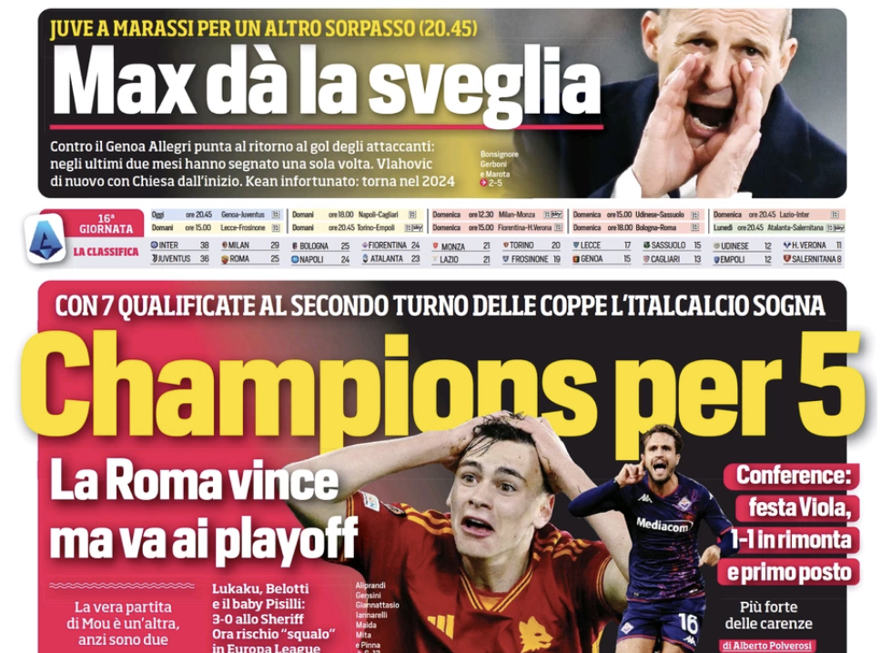 CORRIERE DELLO SPORT – Larghissimo spazio alle parole di mister Allegri, mentre per il Genoa il solito breve approfondimento che parla, più che altro, delle “disgrazie” in casa rossoblu. In primo luogo l’ennesima assenza di Retegui. “Gila, che botta!” è il titolo del breve focus sul Grifone, che spiega come l’attaccante sia alle prese con alcuni guai muscolari. Qualche passaggio dedicato alle parole di mister Gilardino, dopodiché una chiesa finale sul mercato che ormai è alle porte: torna di moda l’obiettivo Zanoli. Pista “molto calda” scrive il CorSport.