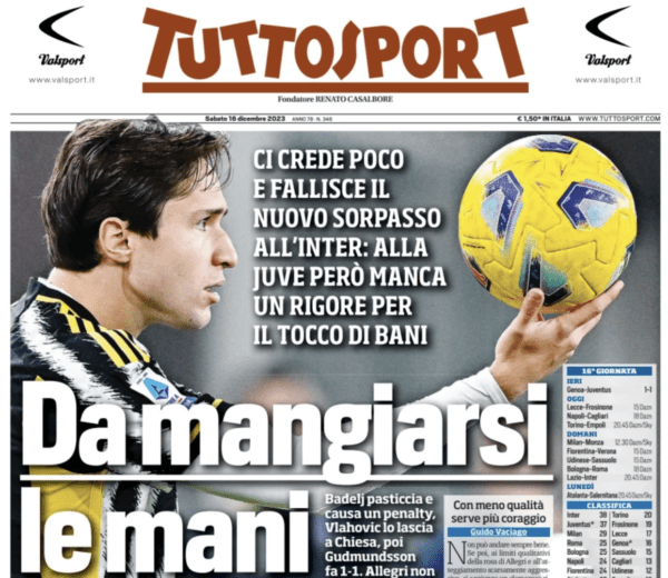 TUTTOSPORT – “Da mangiarsi le mani” è il titolo emblematico di Tuttosport, che prima di tutto mette in primo piano la prestazione non troppo esaltante della formazione bianconera, che “paga la prudenza” del suo tecnico. Anche qui fanno capolino gli episodi arbitrali e si legge chiaramente che “manca un rigore per il tocco di Bani“. Anche qui nessuna menzione che spieghi come il pallone prima tocchi la coscia, poi il braccio. O meglio, la menzione c’è per voce dell’ex arbitro Calvarese che spiega che “nulla conta” tale deviazione. Lo stesso focus parla di un rosso mancante a Malinovskyi nel finale. La sintesi finale, in ogni caso, resta il campo: “L’unica certezza è che la Juventus poteva e doveva fare di più a Marassi, perché una squadra che vuole vincere lo scudetto dove fare sue partite come quella con il Genoa con maggiore lucidità e maggiore cattiveria” scrive Tuttosport.