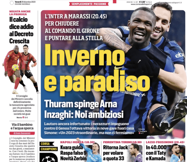 CORRIERE DELLO SPORT – Lo spazio è tutto per l’Inter e la possibilità di diventare Campione d’Inverno battendo il Genoa, che significherebbe anche cogliere la 40esima vittoria dell’anno solare. Del Grifone si parla in un breve trafiletto, dove viene messa in evidenza soprattutto la questione legata a Retegui e Messias che sono pienamente recuperati. Sponda mercato, si legge di un possibile interesse del Milan per De Winter e di un pressing del Genoa (assieme all’Empoli) per Brunori del Palermo. Fronte Zanoli, “sono ore decisive per lo sbarco in Liguria. Tra le due società c’è un accordo per un prestito con diritto di riscatto, va definita solo la cifra, con il via libera definitivo in arrivo appena gli azzurri avranno in pugno il sostituto“.