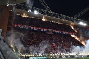 12‘ – Come da recente tradizione, tutto lo stadio alza al cielo la sciarpa. La Gradinata Nord, in particolare, si accende con luci bianche a contorno dei vessilli rossoblu.