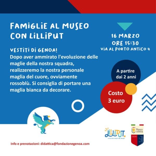 “Marzo è il mese dei colori! Sabato 16 marzo 2023 ore 15.30 vi aspettiamo al terzo evento della rassegna Famiglie al Museo del Genoa con Lilliput! Vestiti di Genoa!” si legge sul sito della Fondazione Genoa, che entra più nel dettaglio sul prossimo laboratorio: “Dopo aver ammirato l’evoluzione delle maglie della nostra squadra, realizzeremo la nostra maglia del cuore, ovviamente rossoblù! Si consiglia di portare una maglia da colorare! Consigliato per bambini a partire dai 2 anni. Prenotazione obbligatoria a didattica@fondazionegenoa.com. Costo 3 euro“.