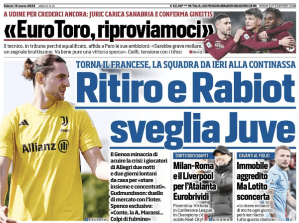 GAZZETTA DELLO SPORT – Il quotidiano in rosa riporta di una Juventus che affronterà un “cliente scomodo” come il Genoa e che, recuperato Rabiot, è andata in ritiro alla Continassa già dalla giornata di ieri per preparare al meglio la sfida coi rossoblù.
