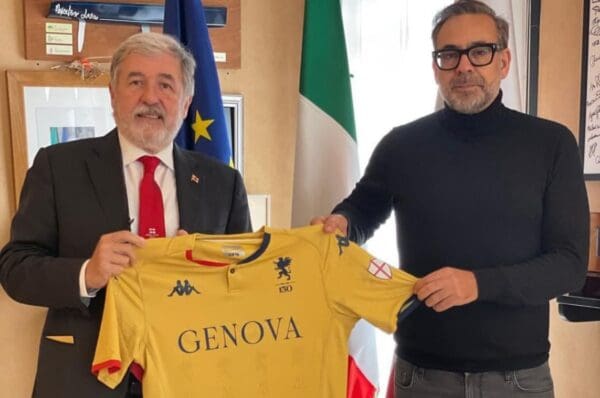 In occasione della Festa della Bandiera che si è celebrata nella giornata di oggi, il Sindaco Marco Bucci ha condiviso, tra le altre, una foto che lo ritrae insieme all’amministratore delegato del Genoa, Andres Blazquez,. I due mettono in mostra la maglia che celebra Genova e San Giorgio che il Grifone indosserà proprio in occasione della prossima partita interna, lunedì contro il Cagliari.