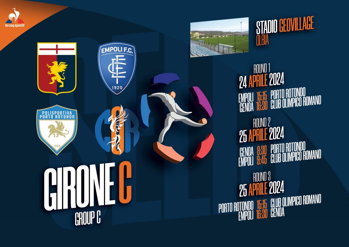 Il Genoa Under 14 è inserito nel Girone C con Empoli, Club Olimpico Romano e Porto Rotondo. I classe 2010 rossoblù giocheranno la prima partita questo pomeriggio, alle ore 16.30, contro il Club Olimpico Romano. Si proseguirà domani, giovedì 25 aprile, con le ultime due gare del Girone C: di mattina presto (ore 8.30) sfida con il Porto Rotondo, alle 16.30 ultima gara con l’Empoli. Passeranno le prime due di ciascun girone. Nello specifico, la prima classifica del Girone C se la vedrà con la prima classificata del Girone G (una tra Inter, Panionios, Urbetevere e Budoni Calcio).