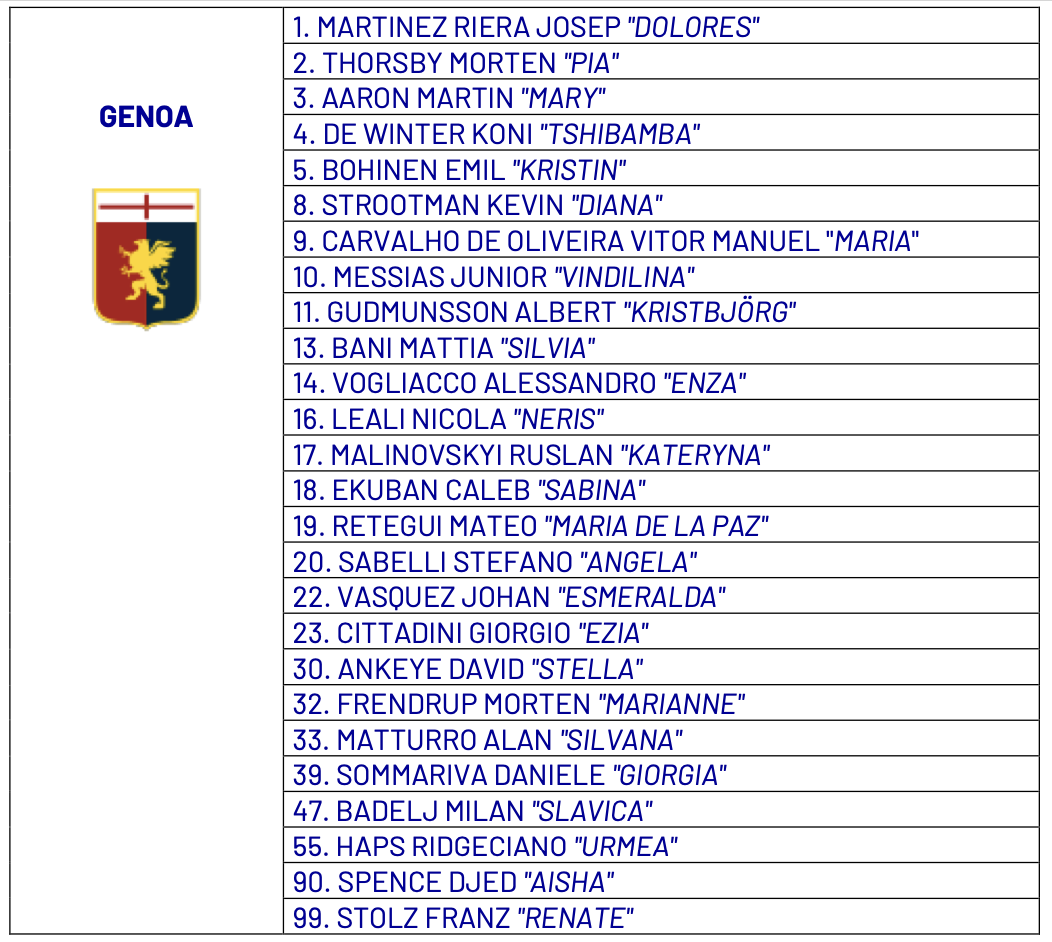 Domenica, in occasione della 36° giornata che coinciderà con la Festa della Mamma, i giocatori del Genoa e di altri sei club di Serie A (Cagliari, Hellas Verona, Lecce, Milan, Torino e Udinese) giocheranno con l’aggiunta, a fianco a nome e numero di maglia, del nome delle loro mamme. A comunicarlo la Lega Serie A con un apposito comunicato. Una bella iniziativa alla quale il club rossoblù ha voluto aderire in occasione di Genoa–Sassuolo.