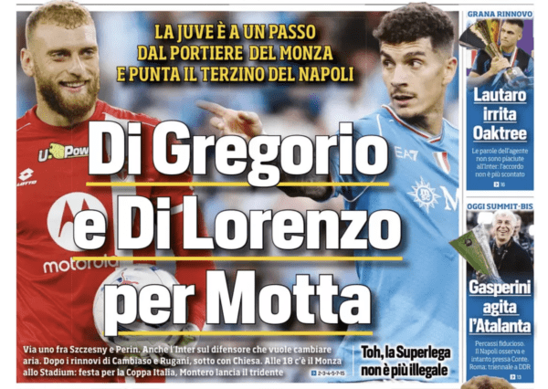 TUTTOSPORT – “Gilardino rovina l’addio di Motta e inguaia la Roma” titola Tuttosport, che scrive: “Ora l’Atalanta può superare il Bologna al quarto posto: così in Champions andrebbero solo le prime cinque“. Spazio anche al tema della Commissione economica che, approvata dal Consiglio dei Ministri, porterà alla nascita di quella che viene definita la “Covisoc del Governo”.