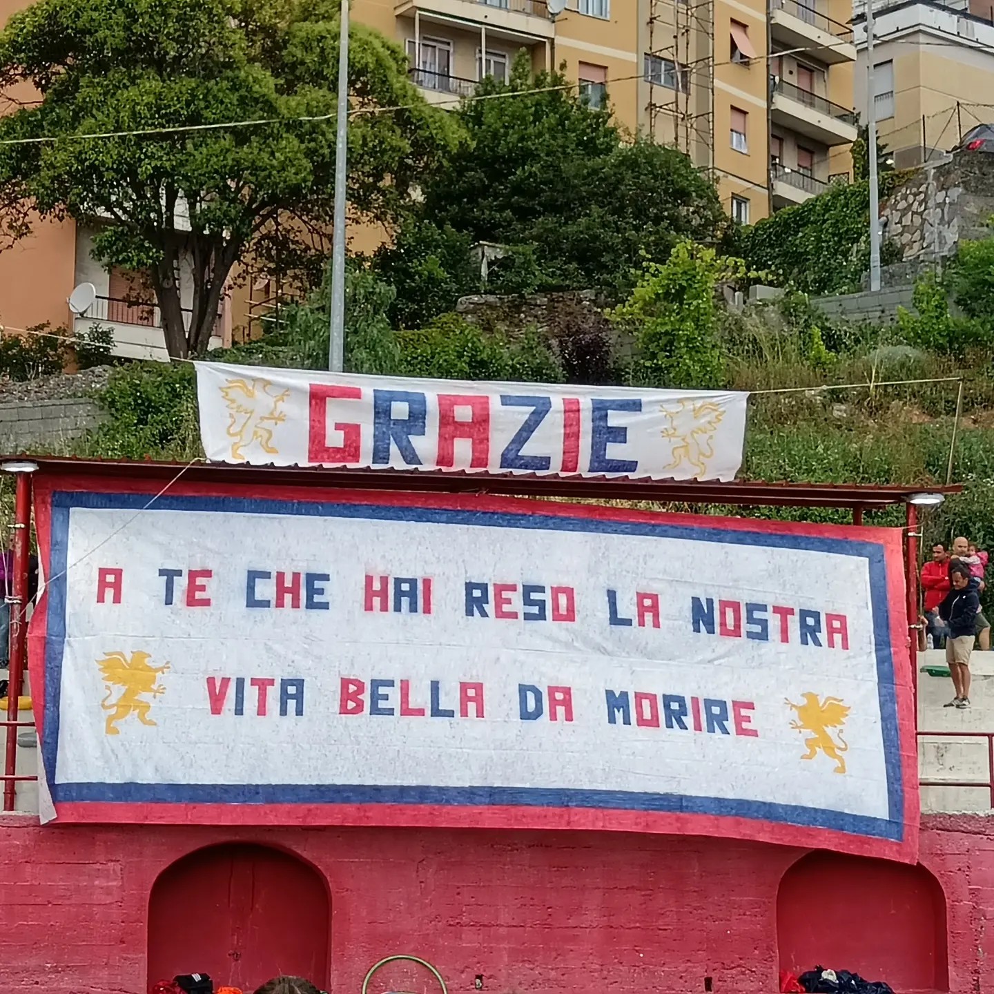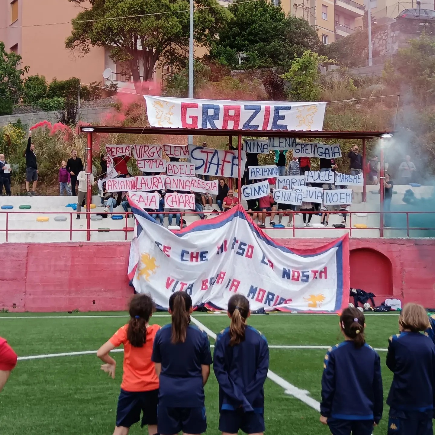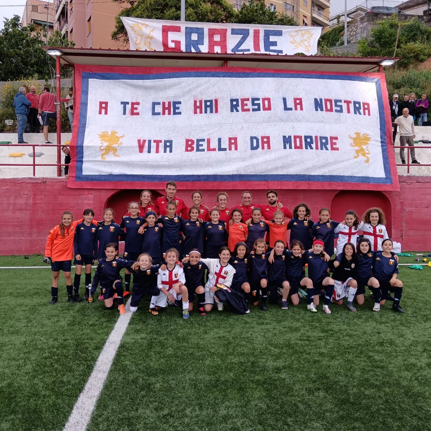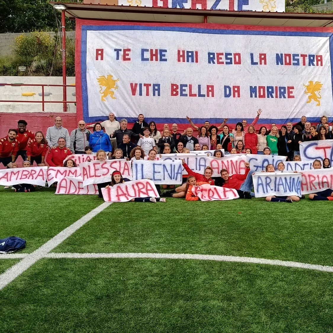 Le grifoncine allenate da mister Giliberto e dalla sua vice Sciaccaluga hanno assistito ad una vera e propria coreografia dei genitori delle piccole giocatrici a quarti rossoblù. Un grosso striscione che recitava “A te che hai reso la nostra vita bella da morire” è comparso sugli spalti: nascondeva alle sue spalle un grosso “GRAZIE” coi nomi di tutte le giocatrici e di tutti i membri dello staff tecnico.
