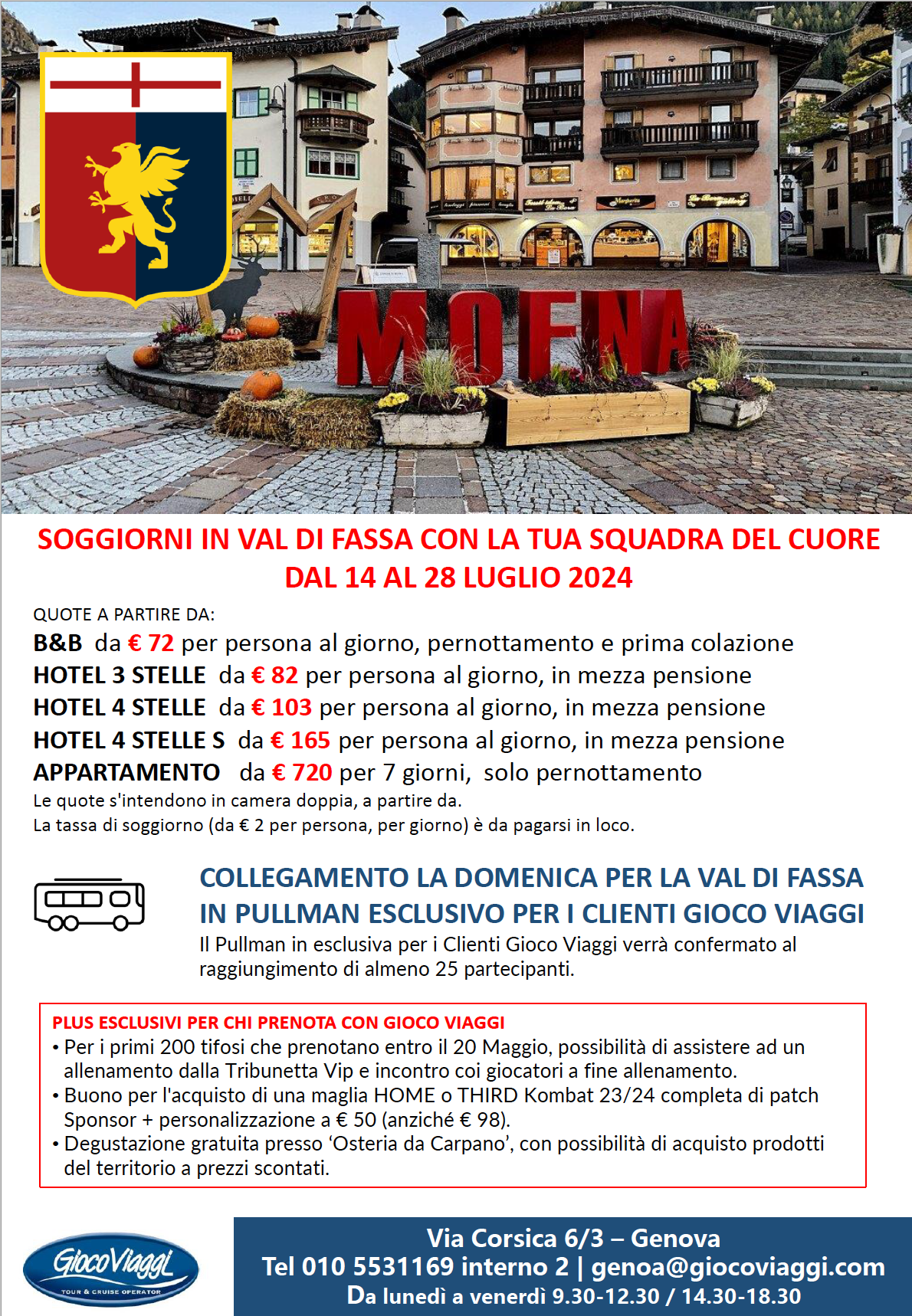 Mentre proseguono le prenotazioni per il ritiro del Genoa a Moena, previsto dal 13 al 26 luglio prossimi, e mentre prosegue l’attesa per l’ufficializzazione delle amichevoli (che dovrebbero essere il 14,20 e 25 luglio), continuano anche a crescere le adesioni al servizio pullman che la Gioco Viaggi mette a disposizione, nella sola giornata di domenica (14 e 21 luglio, ndrI), al raggiungimento di minimo 25 persone prenotate.