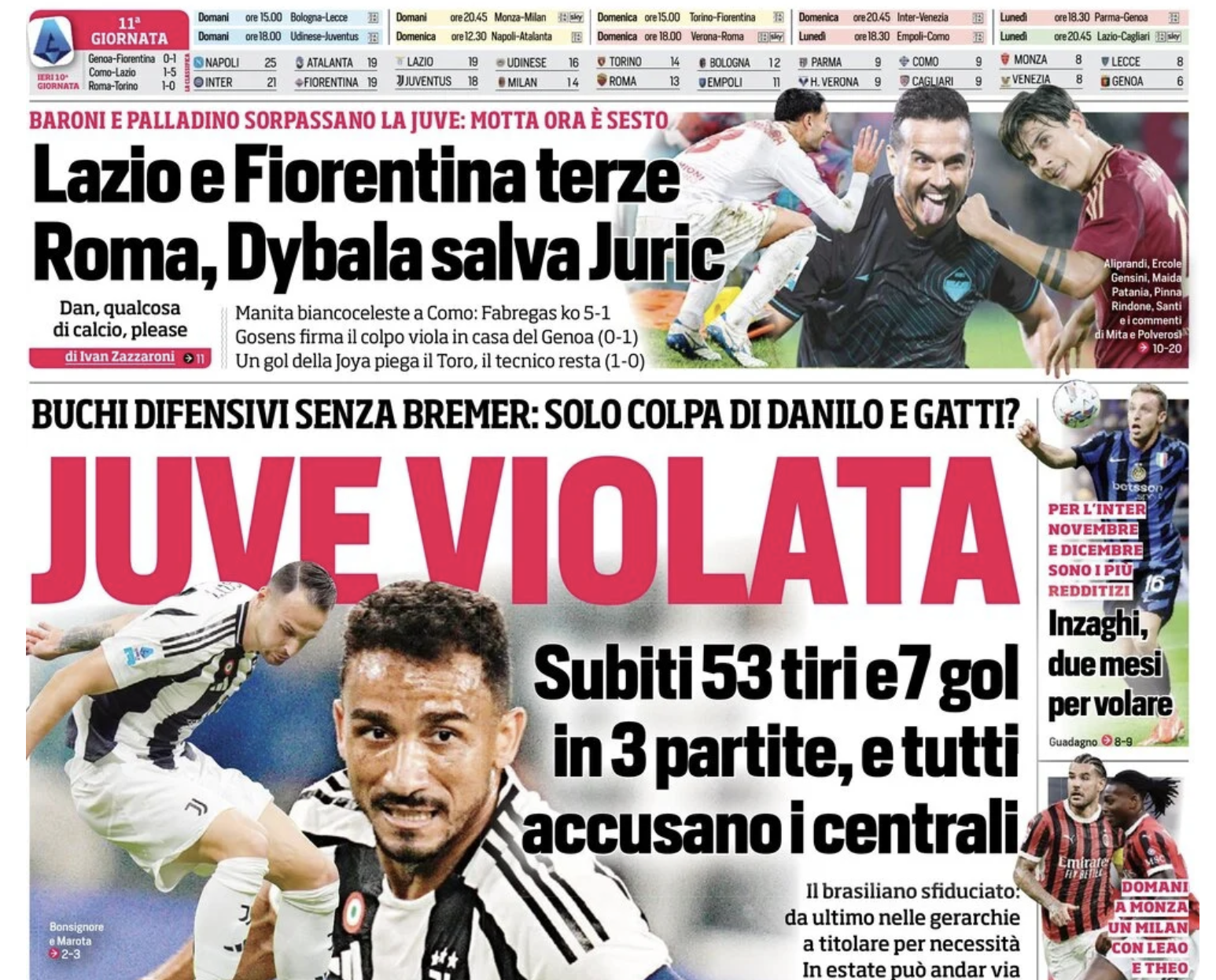 CORRIERE DELLO SPORT – “Lassù c’è anche la Fiorentina” titola il Corriere dello Sport, che evidenzia come la Fiorentina abbia colto la sesta vittoria di fila tra coppe e campionato in una partita definitiva “ruvida”. “La Fiorentina non si ferma più: stende il Genoa con Gosens e si piazza subito dietro Napoli e Inter. Strepitoso De Gea: due parate salva risultato” scrive ancora il quotidiano, che della gara del Genoa sottolinea solamente la parte finale nella quale i rossoblù hanno sbattuto su una “saracinesca“. La moviola non dà ragione a Gilardino circa le lamentele sul presunto fallo di Gosens su Masini in occasione del gol viola, ma si lascia andare ad una assai probabile seconda ammonizione per Martinez Quarta per fallo su Frendrup.
