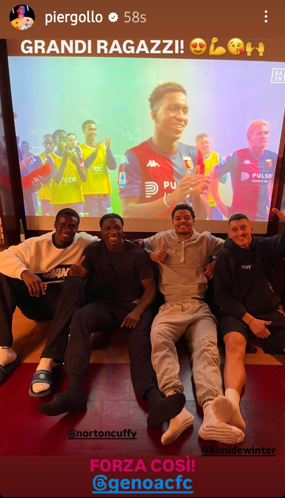 Il Genoa di Alberto Gilardino è tornato alla vittoria espugnando il Tardini e abbandonando le ultime tre posizioni in classifica. Tra i tanti assenti tra le fila rossoblù, oltre a Vitinha che ha seguito la squadra anche a Parma e Bani che ha esultato sui social per i tre punti conquistati, c’erano Norton-Cuffy, Gollini, De Winter ed Ankeye. I quattro calciatori del Grifone, come testimoniato da una foto pubblicata sui social dall’estremo difensore, hanno guardato la partita insieme. “Grandi ragazzi, forza così“, e il commento del portiere ex Atalanta.