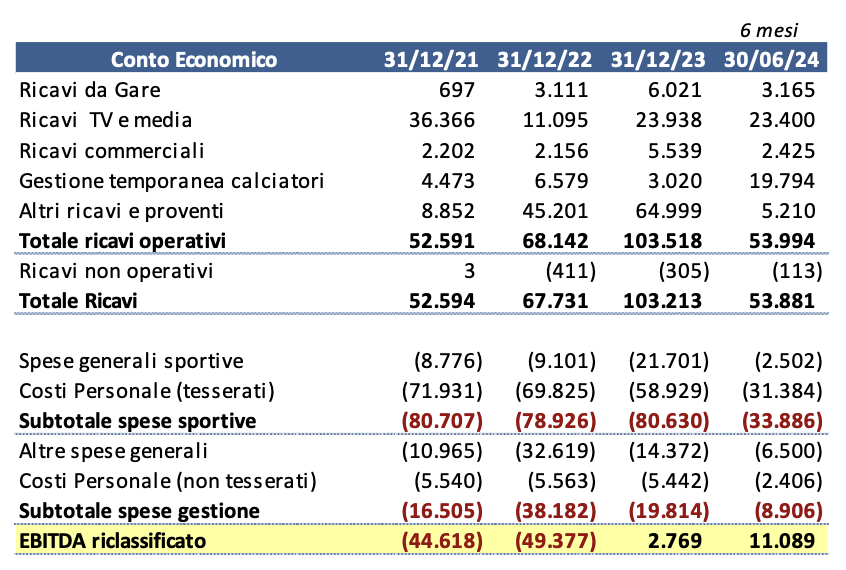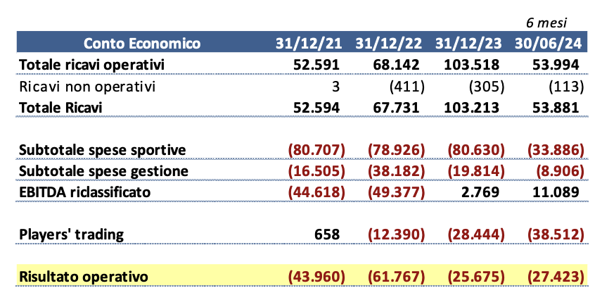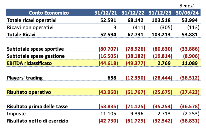 Il primo semestre 2024 è stato molto particolare, pur in presenza di plusvalenze per Euro 21,2 mln (sostanzialmente provenienti dalla vendita di Dragusin a gennaio), in quanto ha scontato due elementi che hanno portato ad un saldo negativo: