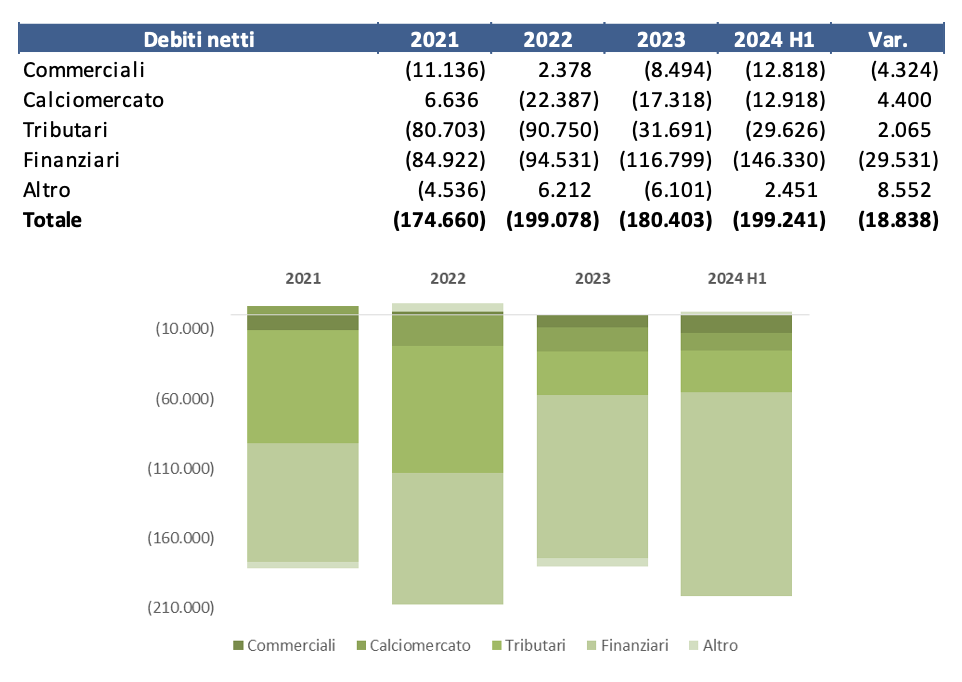 La componente prevalente è rappresentata dei debiti di natura finanziaria che però, trattandosi di un periodo di fine esercizio (giugno) diverso dagli altri, scontano alcune specificità dell’andamento stagionale. Fra fine maggio ed i primi di giugno, infatti, le società di calcio sono tenute a completare i propri adempimenti formali, essendo in quel momento in corso le verifiche per il rilascio della Licenza Nazionale da parte della FIGC. La Società ricorda nella Relazione sulla Gestione che l’incremento dei debiti verso altri finanziatori è “principalmente dovuto all’aumento delle posizioni di factoring relative all’anticipo sui diritti audiovisivi e all’anticipo degli incassi derivanti dalle vendite di alcuni calciatori”, probabilmente utilizzati anche per garantire i pagamenti richiesti entro le scadenze previste.