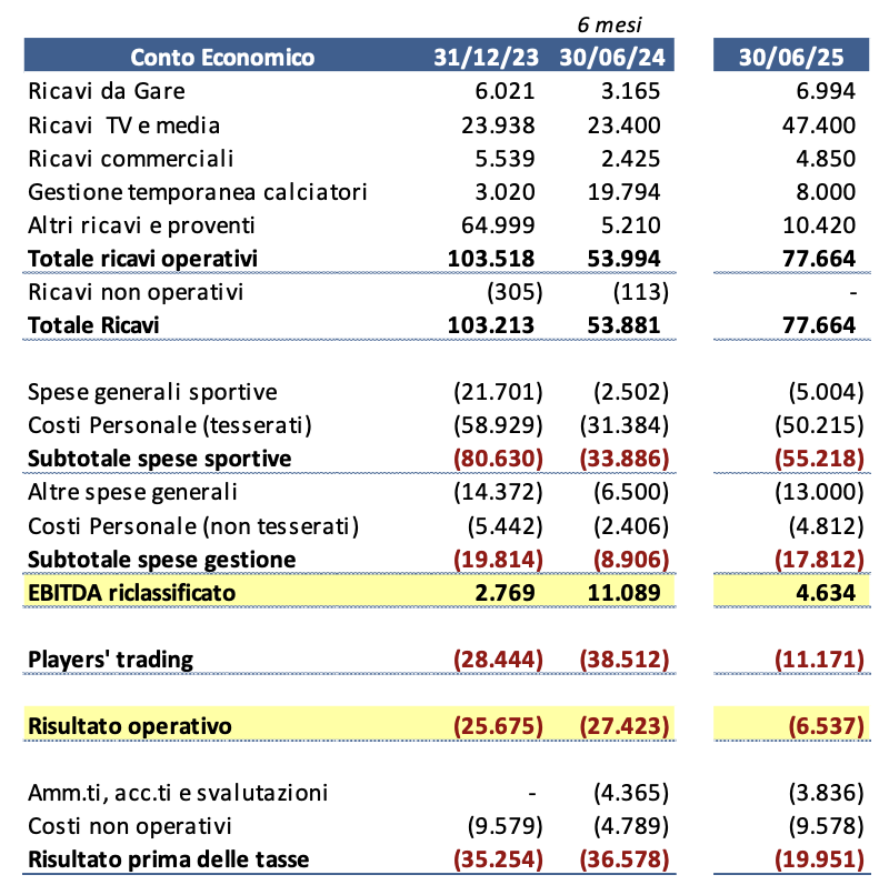 Con la doverosa premessa che si tratta di una mera simulazione basata sui dati disponibili e sulle notizie reperibili fra i mass media, è ragionevole pensare che grazie alle plusvalenze già prodotte dal calciomercato estivo, al 30 giugno 2025 l’EBITDA riclassificato continuerà ad essere positivo ma, al netto di ulteriori operazioni in uscita, anche il risultato del 2024/25 sarà negativo.