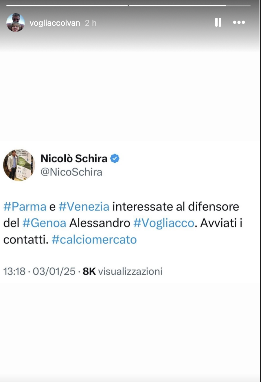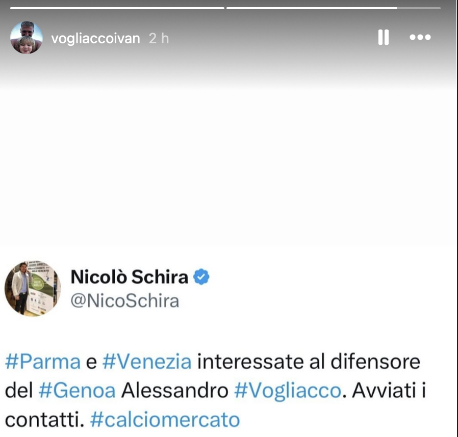 Sicuramente non è passata inosservata la storia condivisa qualche ora fa via social dal fratello, Ivan, che ad inizio campionato si era tatuato l’esultanza di Alessandro dopo la prima rete in Serie A contro l’Inter. Ha ricondiviso un post di mercato nel quale si parla di primi contatti avviati tra due club (Parma, che oggi ha comunque chiuso per un difensore mancino, e Venezia, ndr) e Vogliacco. Un indizio che conferma come il difensore rossoblù, fresco di rinnovo fino al 2027 firmato lo scorso settembre, sia ambito da tante formazioni di Serie A, peraltro tutte concorrenti del Genoa per l’obiettivo salvezza.