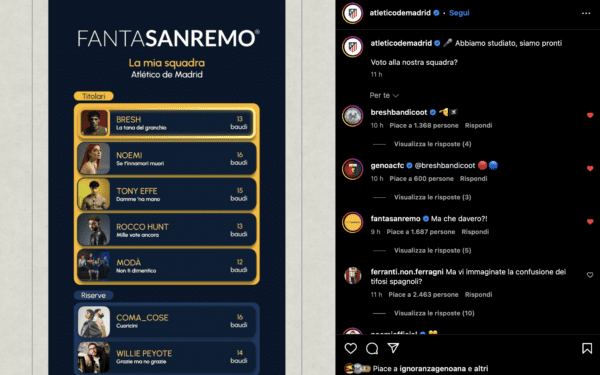 Il Festival di Sanremo non è più un fenomeno solo musicale, ma un fenomeno sociale. Nel caso in questione, è diventato proprio un fenomeno social. Come esiste il fantacalcio, esiste il Fantasanremo, e tra chi ha deciso di costruire la propria squadra di cantanti che si esibiranno all’Ariston si è palesato anche l’Atletico Madrid, che in testa al proprio team ha messo Bresh e ha chiesto un commento ai propri followers sulla squadra creata. Tra i primi commenti quello di Bresh e, soprattutto, quello del Genoa, in un simpatico siparietto su Instagram che ha coinvolto due club fra i più attivi e innovativi nel mondo della comunicazione social.