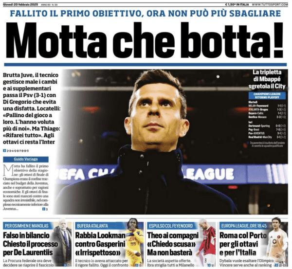 CORRIERE DELLO SPORT – Il quotidiano sportivo prosegue, come ieri, sul tema Inter e valutazioni sulla squadra da schierare sabato contro il Genoa. Dei tre diffidati Bastoni, Barella e Mkhitaryan potrebbero andarne in panchina almeno due. Da valutare anche le condizioni di Thuram e Carlos Augusto.