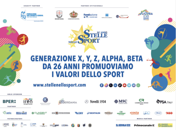 Nel 2025 si rinnova così l’impegno quotidiano al fianco di Federazioni e Associazioni sportive, Scuole ed Istituzioni, portato avanti con il sostegno di Regione Liguria, Comune di Genova e Fondazione Carige, il patrocinio di Sport e Salute, Coni, CIP, USR Liguria, Università di Genova, USSI, Panathlon, Genoa Cfc, Uc Sampdoria e Ac Spezia, le sinergie istituzionali con Porto Antico e Camera di Commercio di Genova, il contributo dei Gold Sponsor BPER, Iren luce gas e servizi, Villa Montallegro, Eco Eridania, Novelli 1934, MSC Crociere, Cambiaso Risso e PSA Italy e dei partner Amiu, Italmatch Chemicals, Clindent, Gruppo Messina, GNV, Decathlon, Panarello, Genovarent, Costa Edutainment, Lido Genova, Prai e ETT. All’indirizzo www.stellenellosport.com/amici tutti i protagonisti di questa grande rete.