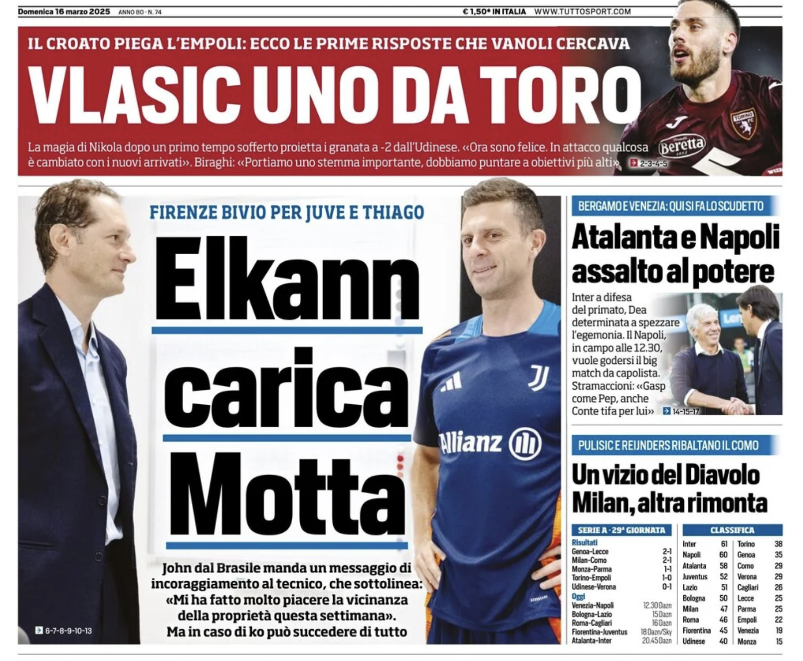 GAZZETTA DELLO SPORT – Lo stesso argomento lo si ritrova all’interno della Gazzetta dello Sport, che più che di fiducia a tempo, spiega che la Juventus andrà “avanti con Motta” e che Giuntoli è convinto che la formazione bianconera possa uscirne assieme a Thiago Motta. Resta il fatto, come sottolinea il quotidiano, che per il tecnico ex Bologna ogni gara sarà un “esame” da qui a fine stagione. Si legge che filtra preoccupazione dalla Juventus per quanto riguarda le condizioni fisiche di Cambiaso e Kelly, che oggi si sottoporranno ad esami strumentali. Un altro approfondimento riguarda invece Fabio Miretti, che dopo la doppietta contro il Lecce si è ripreso la scena dal punto di vista mediatico. “Due gol salvezza per il Genoa. “Qualche fischio mi ha caricato” si legge nel focus che apriva col titolo “La rivincita di Miretti“.