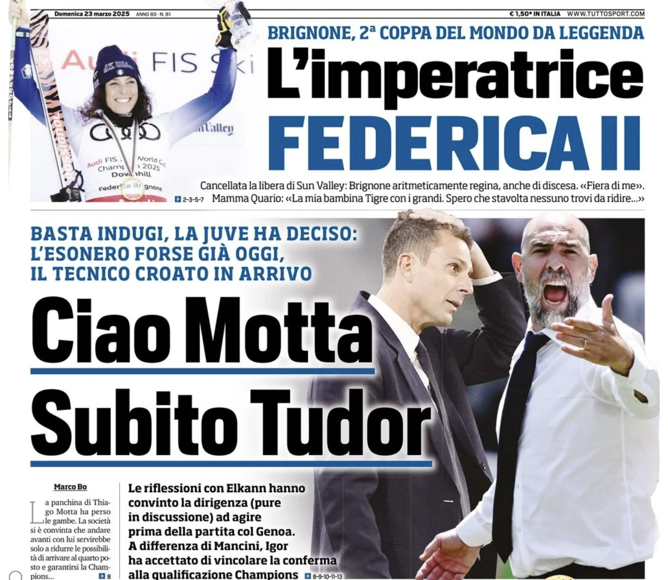 GAZZETTA DELLO SPORT – “Motta tiene il punto” titola stamane la Gazzetta dello Sport, che aggiunge: “Un uomo solo con le sue idee aspetta il Genoa“. L’articolo è possibilista su una permanenza, almeno fino a sabato, del tecnico bianconero, anche se gli ultimi sviluppi sembrano indirizzare verso una transizione con Tudor.