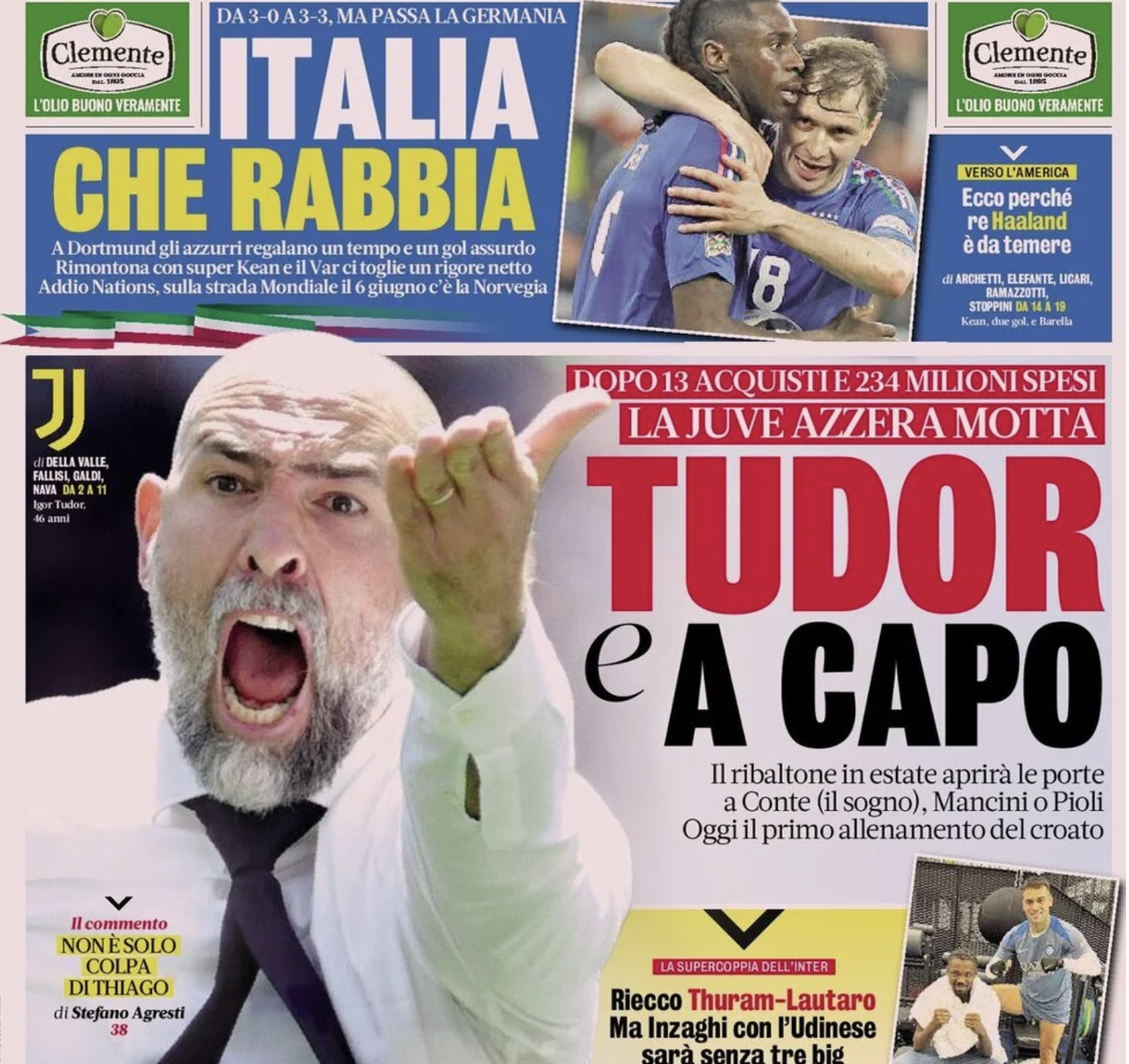 CORRIERE DELLO SPORT – Il Corriere dello Sport si sofferma sul cambio in panchina in casa Juventus, con Tudor che ha avvicendato Thiago Motta. “Finisce dopo 9 mesi un progetto costato 252 milioni. Evitato un caso per il Genoa” scrive il quotidiano sportivo, che si focalizza anche sul 3-4-2-1, modulo che il nuovo allenatore bianconero potrebbe portare avanti.