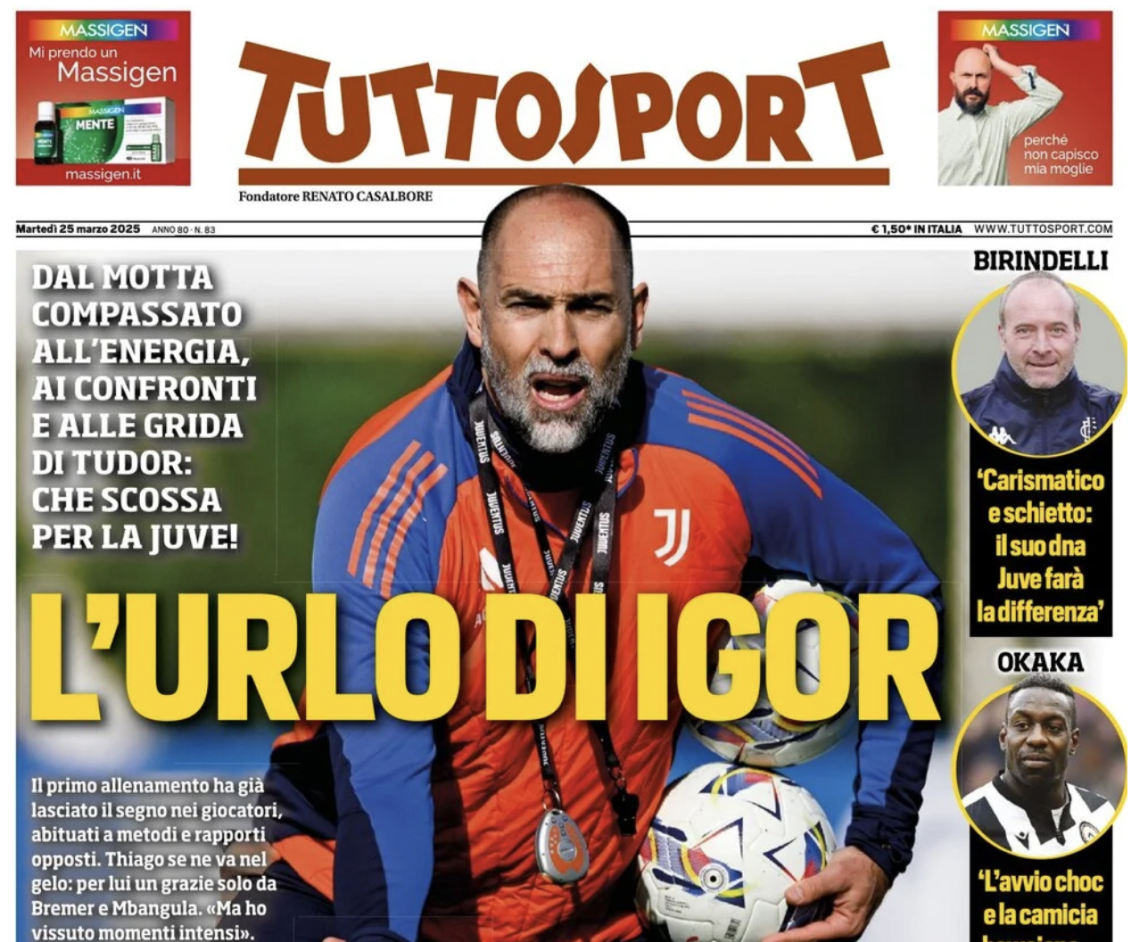 CORRIERE DELLO SPORT – Il Corriere dello Sport parla del primo giorno di Igor Tudor alla Juventus e delle valutazioni in sede di infermeria, con Cambiaso e Douglas Luiz che per adesso continuano a lavorare a parte (ma per loro non si esclude un recupero per la sfida col Genoa). Poco a poco rientreranno anche i nazionali bianconeri e andranno valutati al loro rientro.