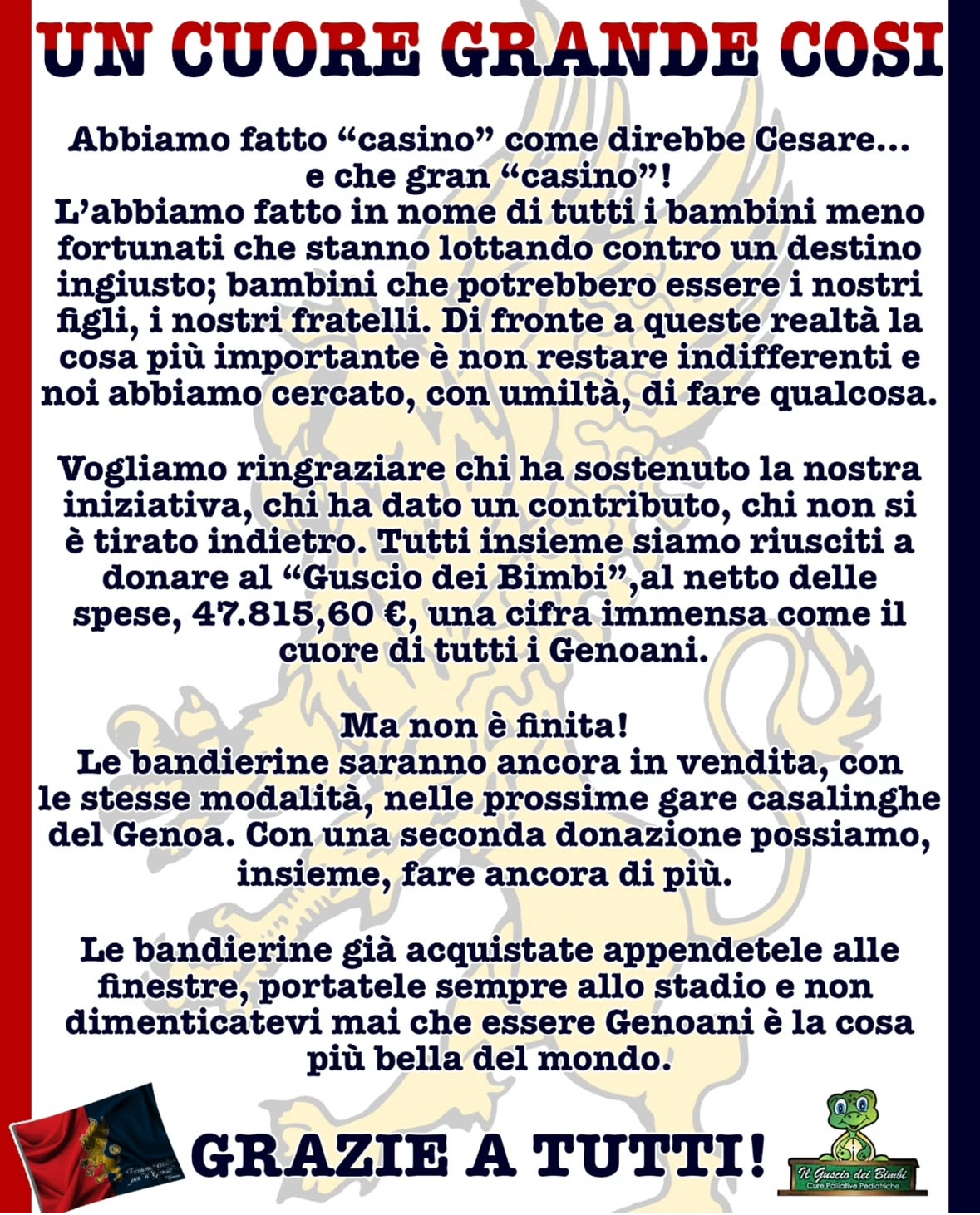 Ma non è finita! Le bandierine saranno ancora in vendita, con le stesse modalità, nelle prossime gare casalinghe del Genoa. Con una seconda donazione possiamo, insieme, fare ancora di più. Le bandierine già acquistate appendetele alle finestre, portatele sempre allo stadio e non dimenticatevi mai che essere Genoani è la cosa più bella del mondo. GRAZIE A TUTTI!“.