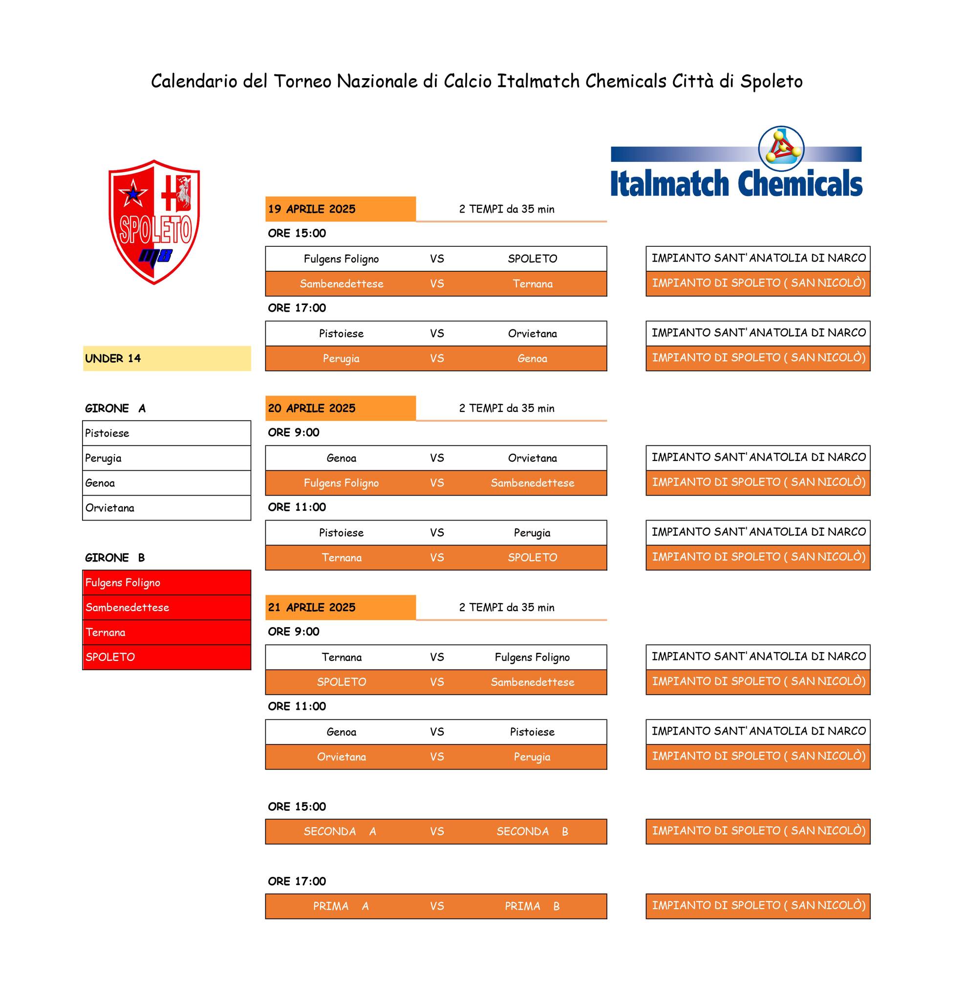 Le vacanze pasquali sono da anni un momento per tornei e kermesse giovanili. Il Genoa Under 14 non fa eccezione e da quest’oggi è impegnato nel Torneo Nazionale di Calcio Italmatch Chemicals – Città di Spoleto assieme a Perugia, Ternana, Orvietana, Fulgens Foligno, Pistoiese, Spoleto e Sambenedettese.