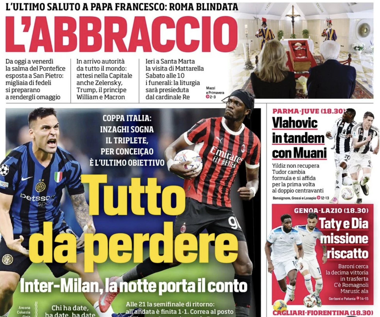 TUTTOSPORT – “La Lazio d’Europa passa da Marassi” titola questa mattina Tuttosport, che divide in un unico approfondimento la vicende di casa rossoblù da quelle di casa biancoceleste. Si legge, in apertura: “L’obiettivo del Genoa re sta quello di pochi giorni fa, prima del rinvio del match. I rossoblù con la Lazio hanno tanta voglia di regalarsi il primo colpo stagionale con una big e nel contempo vogliono chiudere anche matematicamente un discorso salvezza che – va detto – non è in discussione ormai da mesi. La testa e le gambe dovranno essere quelle giuste, perché Patrick Vieira – dopo il pareggio di Verona arrivato con una prestazione sotto tono rispetto alla precedente vittoria con l’Udinese – ha chiesto ai suoi di dare il massimo in questo finale di stagione“.