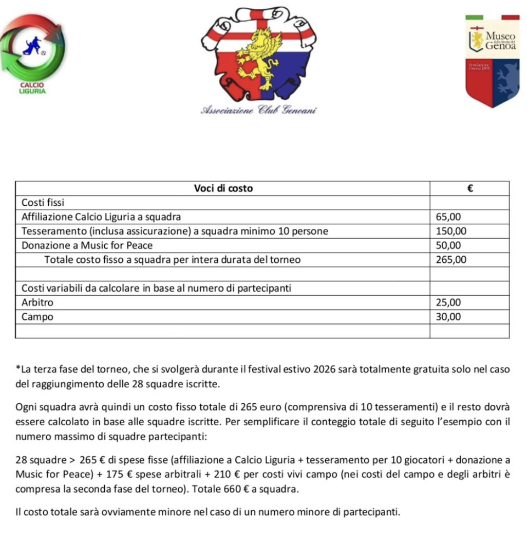 L’ACG (Associazione Club Genoani), con il patrocinio del Genoa CFC 1893 e della Fondazione Genoa, organizza un torneo di calcio a 5 riservato a tutti i club del Genoa e ai suoi tesserati, che si svolgerà presso la struttura dell’associazione Music for Peace.