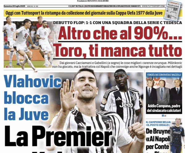 TUTTOSPORT – Tuttosport, tracciando in Frendrup la figura del regista che potrebbe sostituire Cahlanoglu in caso di partenza dall’Inter, del Genoa scrive: “Gronbaek: doppietta nel test in famiglia“. Si parla anche della vendita libera che scatterà martedì 22 luglio (clicca QUI per conoscere le modalità).