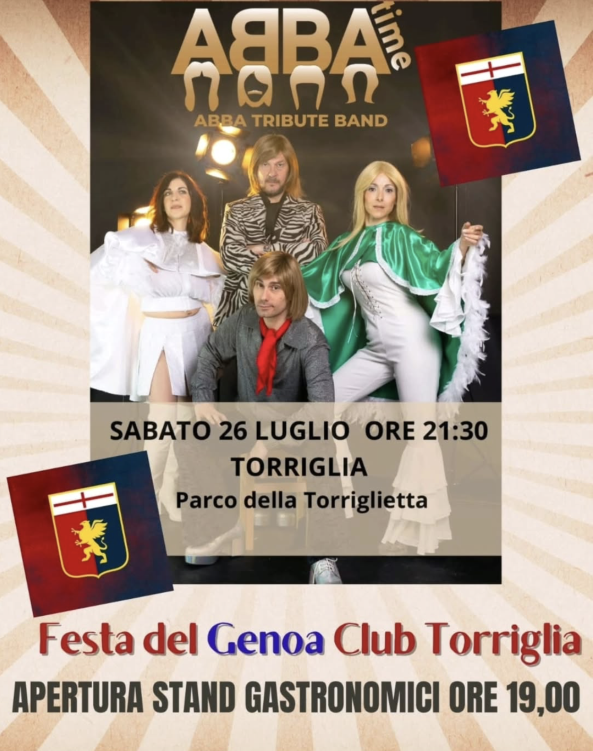 Nella serata di sabato 26 luglio, presso il Parco della Torriglietta, il Genoa Club Torriglia festeggerà assieme ai propri iscritti e ai tifosi rossoblù. L’apertura degli stand gastronomici è prevista per le ore 19: seguirà un concerto degli Abba Time, tribute band degli ABBA. Di seguito la locandina dell’evento: