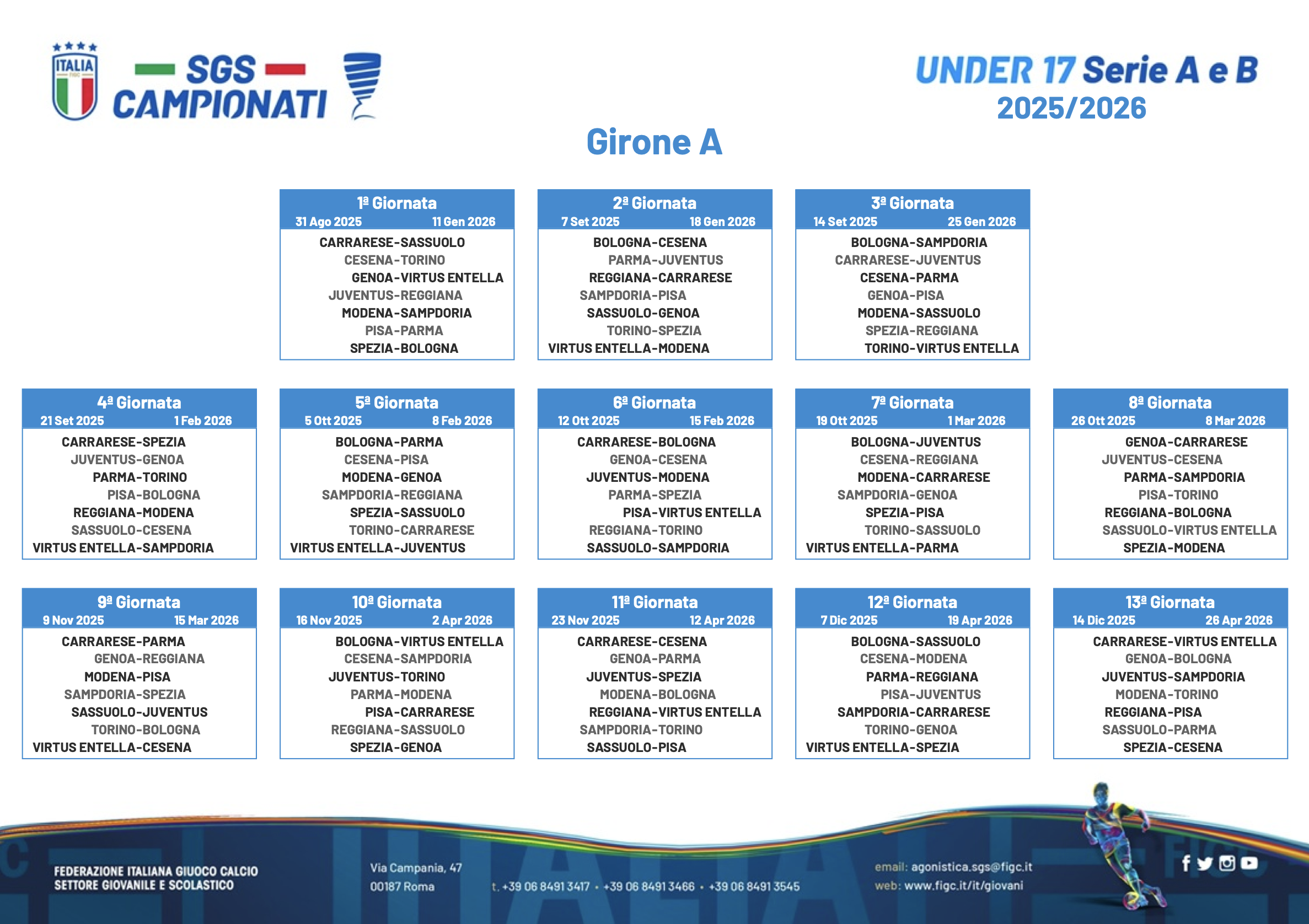 Dopo la diffusione del calendario del Genoa Under 18 (clicca QUI per saperne di più), la FIGC ha diramato anche il calendario del Genoa Under 17 guidato da mister Criscito. Per i classe 2009 rossoblù l’esordio è fissato per domenica 31 agosto 2025, a Begato, contro la Virtus Entella. Di seguito il calendario completo: