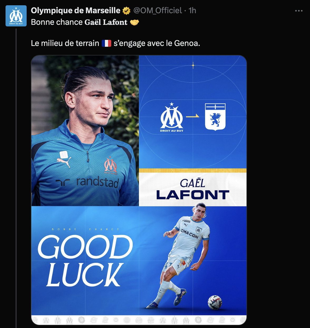 Il talentuoso centrocampista classe 2006 Gaël Lafont è un nuovo giocatore del Genoa. Il calciatore, che aveva salutato già ieri i suoi ex compagni di squadra nell’academy marsigliese, arriva a titolo definitivo dall’Olympique Marsiglia. A darne comunicazione i canali ufficiali del club francese su X: