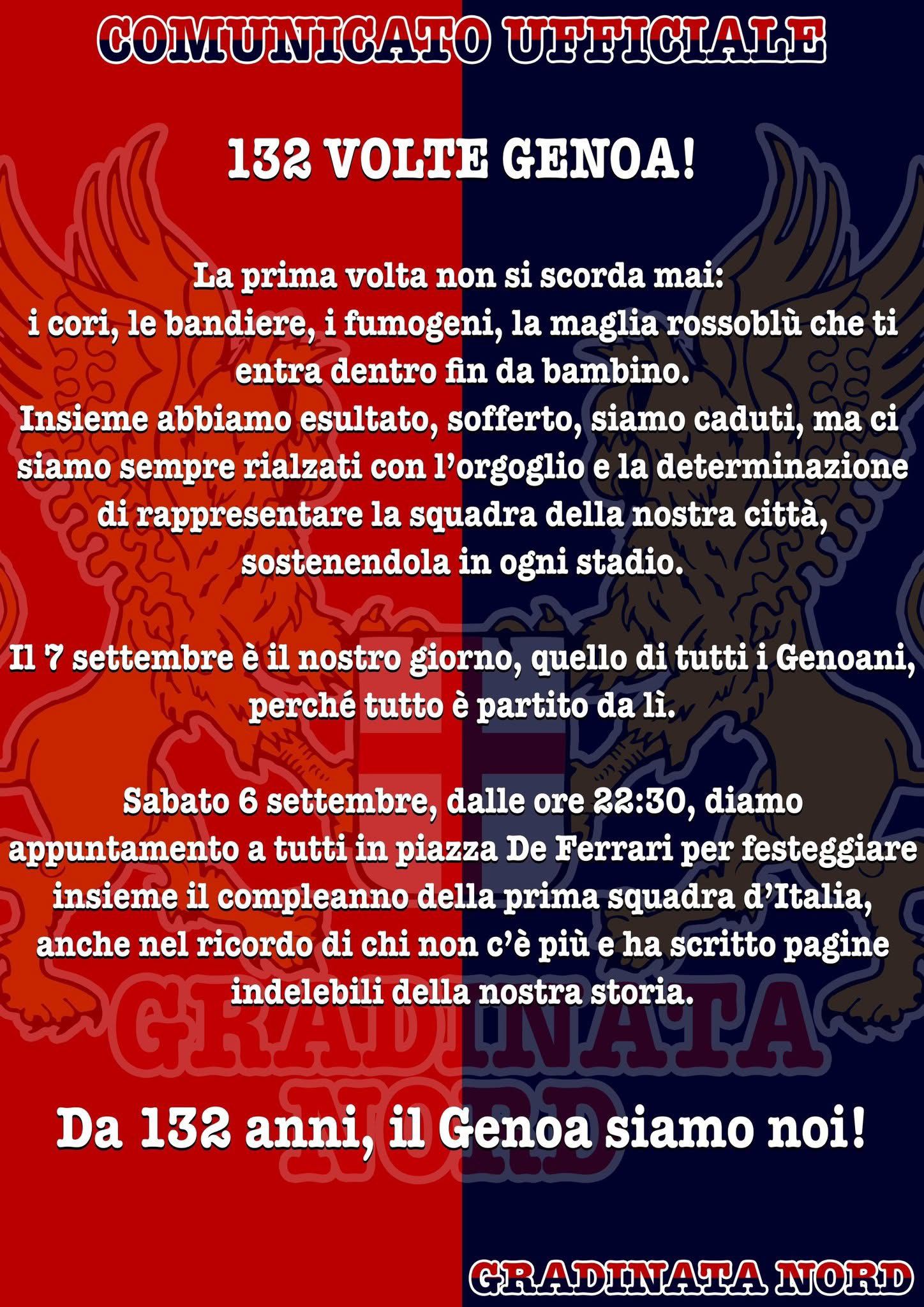 Nella serata di sabato 6 settembre, come da tradizione, i tifosi del Genoa si raduneranno nel cuore della città ad attendere la mezzanotte e l’ingresso nella giornata del 7 settembre, che quest’anno significherà 132 anni di Genoa. La Gradinata Nord ha chiamato a raccolta la tifoseria in Piazza De Ferrari dalle ore 22.30 con un comunicato.
