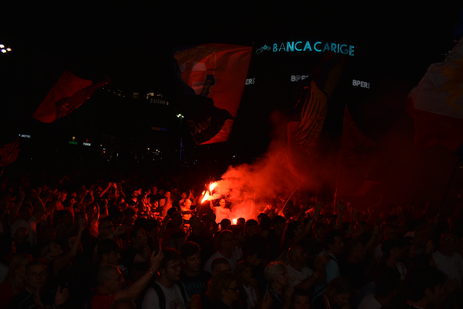 Il raduno dei tifosi si è tenuto intorno alle ore 22.30 nella piazza principale della città, dove si sono riuniti almeno 5000 tifosi. Bandiere, sciarpe, cori, fumogeni, ogni fascia d’età rappresentata in una colorata festa rossoblù.