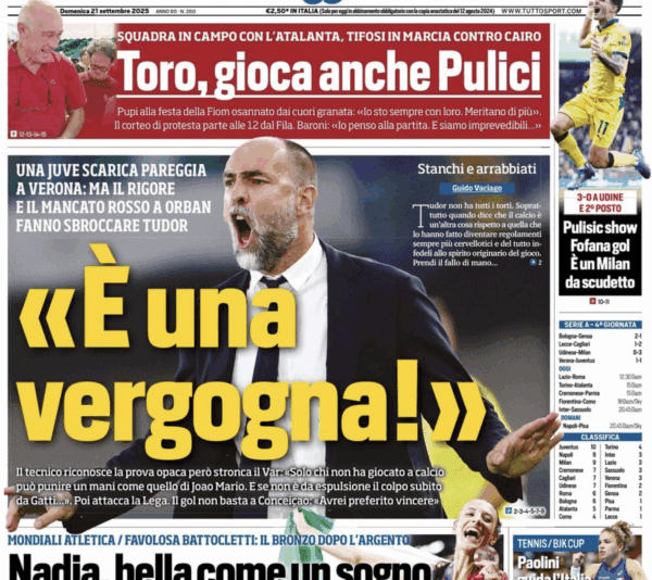 TUTTOSPORT – “Decide Orsolini, rigore al 99′. Rabbia Genoa” titola stamane Tuttosport, che sulla decisione di Collu tutto fa tranne che prendere una posizione (anche se il 6 in pagella all’arbitro sardo, una sciagura per il Genoa che ne ha perse 4 su 4, è abbastanza indicativo del giudizio sull’operato arbitrale accordato dal quotidiano). Si legge, in apertura: “Il primo pubblico annuncio al Dall’Ara nella storia del VAR è dolce come il miele per il Bologna, mentre suscita reazioni furenti in casa Genoa, con annessa espulsione di Patrick Vieira. Il rigore segnalato da Lissone, e assegnato dopo la revisione da Collu, scatena la gioia della squadra di Italiano, prima spenta poi accesasi d’incanto con il gol di Ellertsson. Poteva essere una di quelle partite in cui chi segna per primo alla fine la vince. E invece il colpo da biliardo di Castro e il penalty trasformato al minuto 99 da Orsolini hanno mandato il tavolo gambe all’aria“.