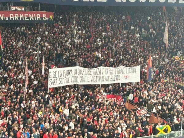 In occasione della sfida tra Genoa e Lazio di questa sera, la Gradinata Nord ha deciso di manifestare il proprio sostegno a Gaza e al popolo palestinese rimanendo in silenzio per i primi cinque minuti del match. Inoltre, sugli spalti è comparso uno striscione che recita: “E se la paura di guardare di Gaza vi ha fatto chinare il mento, sarà sempre complicità il vostro infame silenzio“.