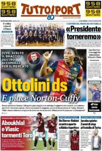 Su Ottolini vi è anche un secondo focus che titola: “Vieira e Retegui i due capolavori. Il DS stratega senza portafoglio“. Su Norton-Cuffy, invece: “Norton-Cuffy, la cura ai guai della fascia“. Come già scritto ieri, al momento non ci sono conferme di un imminente addio del dirigente dal Genoa, col quale la Juventus non ha avuto alcuna interlocuzione. Tra le due parti, Genoa e Ottolini, rimane la volontà di proseguire assieme con un rinnovo di cui si discute da tempo. Peraltro, un suo passaggio alla Juventus, a stagione in corso, richiederebbe una deroga federale trattandosi di un passaggio di un dirigente da un club di Serie A ad altro club di Serie A. Dirimenti le prossime settimane. Un terzo focus a sé stante se lo prendono alcuni passaggi dell’intervista di mister Jacopo Sbravati ai media. Il titolo che Tuttosport sceglie è: “Nuredini e Zulevic i prossimi Ekhator” (clicca QUI per leggere e ascoltare la nostra video intervista).
