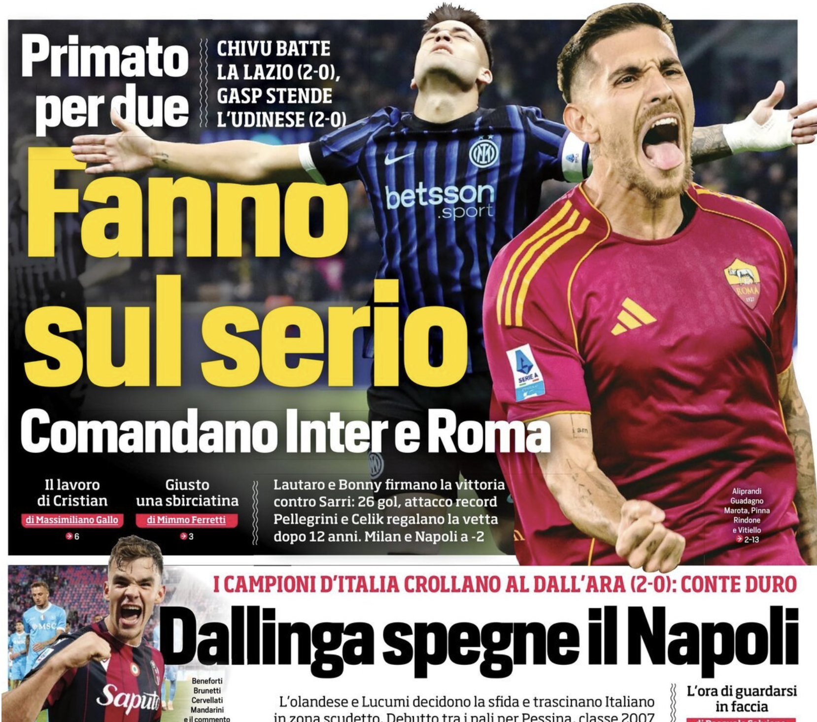 GAZZETTA DELLO SPORT – “De Rossi-Vanoli, un sorriso a metà. Genoa e Fiorentina tra errori e gol restano in zona B” titola questa mattina la Gazzetta dello Sport, che prosegue nell’analisi del pareggio del Ferraris. “La gara che volevo. Non mi sono messo a fare il fenomeno” dichiara De Rossi a margine della partita nella lunga conferenza stampa post partita (che puoi leggere integralmente QUI).