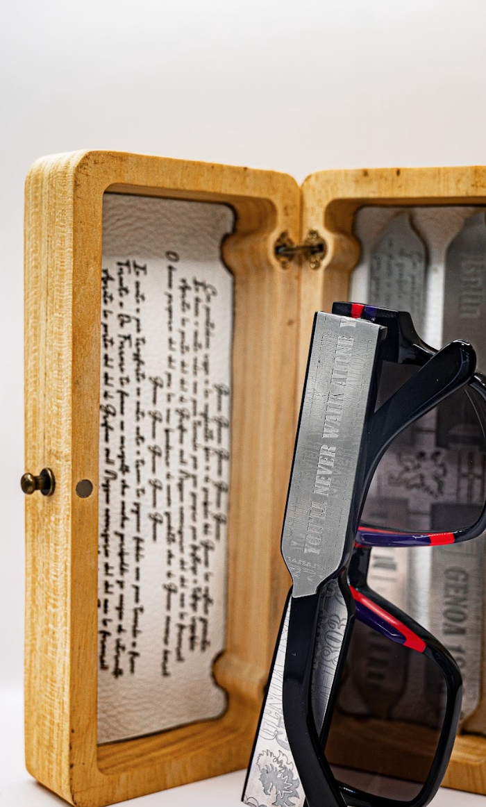 IL COMUNICATO SULL’INIZIATIVA – “Da questa sfida nasce un lavoro complesso, innovativo e profondamente simbolico. Per superare i limiti di spazio tipici dell’occhialeria, l’artigiano ha progettato due aste maggiorate, pensate per accogliere inserti metallici incisi a laser: qui trovano posto alcuni dei simboli più evocativi dell’universo rossoblù. Dallo scudetto ufficiale al Gallinaccio, introdotto dal club nel 1979 e tornato nelle divise recenti; dalla scritta Genoa 1893 allo storico slogan You’ll Never Walk Alone; fino alla straordinaria incisione a mano della strofa centrale di “Un Cantico per il Mio Grifone”, inno ufficiale della società, riportata integralmente su una delle aste.