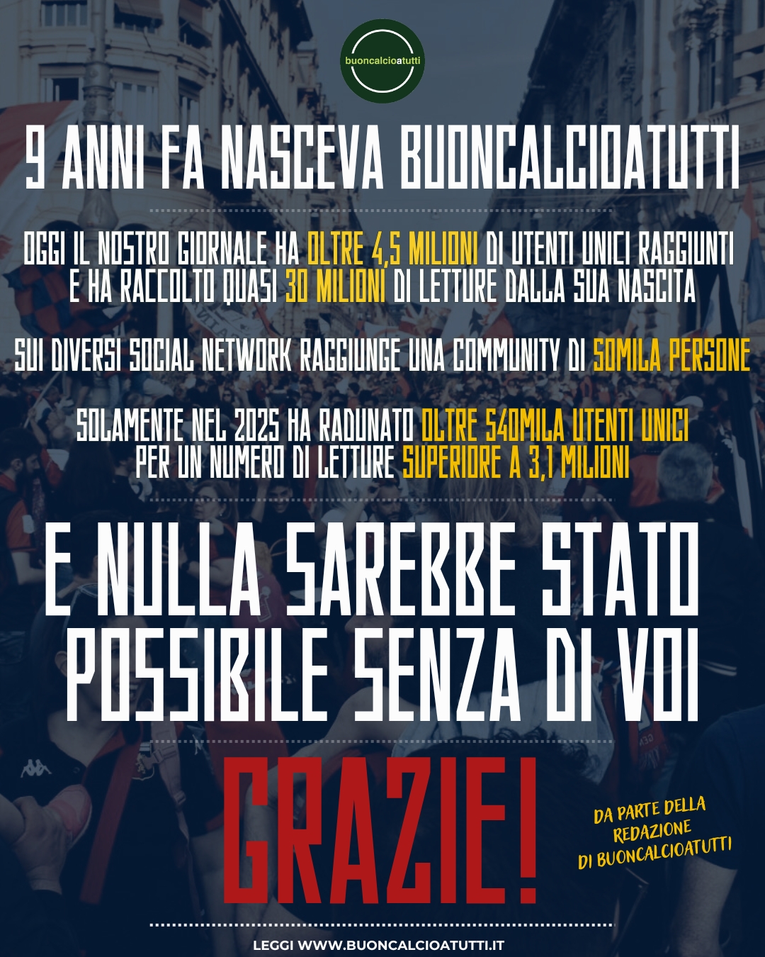 Nell’ultimo anno, da gennaio 2025 alla data odierna, abbiamo raggiunto 540mila utenti e le letture complessive si attestano intorno a 3,1 milioni. Ma c’è di più! Da quando abbiamo cominciato questa lunga avventura, nel lontano dicembre 2016, oggi Buoncalcioatutti ha pressoché toccato 30 milioni di visualizzazioni di pagina e circa 4,5 milioni di utenti unici nel mondo, due dati che ci inorgogliscono ancora di più. Due dati che, nel contempo, ci responsabilizzano nei confronti di chi ci legge.