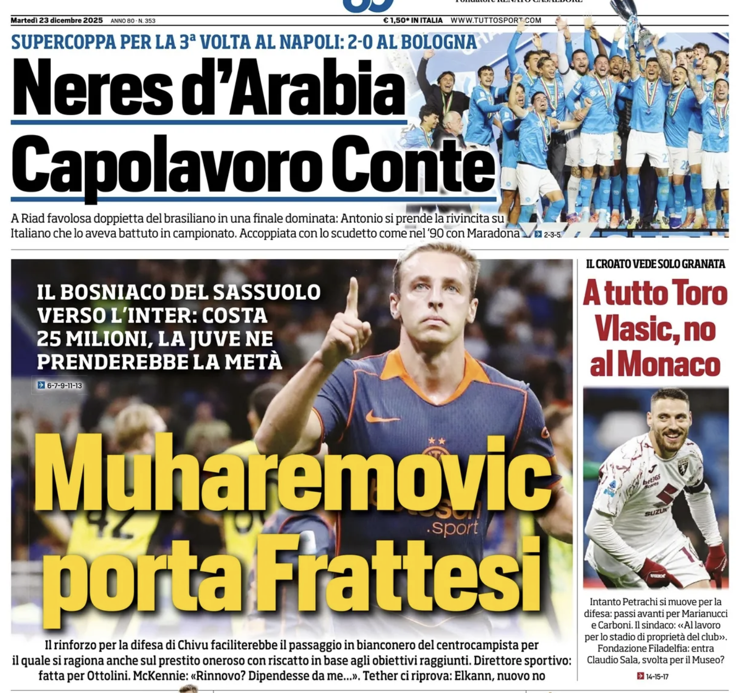 TUTTOSPORT – Tuttosport parla di Ottolini ormai destinato a diventare il nuovo direttore sportivo della Juventus, che potrebbe presto entrare in trattativa col Genoa per Perin. I rossoblu hanno intenzione, come scrive Tuttosport, di fare un 2026 a cinque stelle sul fronte degli innesti di mercato. “Sono addirittura cinque i rinforzi nel mirino del Genoa: un portiere, un paio di difensori (un centrale e un terzino), un centrocampista e una punta. Insomma, restyling completo all’orizzonte per il club rossoblù, che ha messo gli occhi su Mattia Perin come prima scelta per la porta”. Focus a sé stante anche per l’archiviazione delle accuse rivolte al CEO Blazquez.