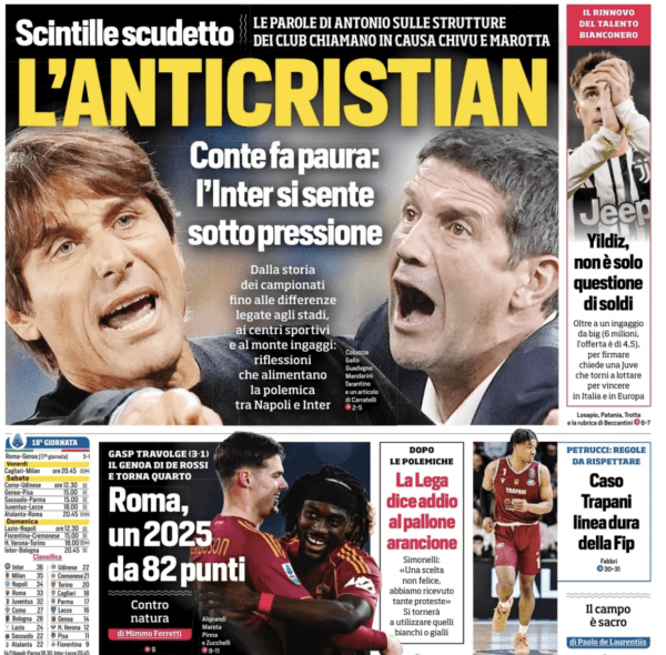 CORRIERE DELLO SPORT – Il Corriere dello Sport elogia la Roma, che grazie alla vittoria col Genoa è la squadra ad aver fatto già punti nell’anno solare 2025, e titola: “Dominio Gasp, Daniele s’inchina“. L’analisi della gara è tutta di marca giallorossa a testimoniare quanto presto il Genoa sia uscito dalla partita, qualcosa assolutamente di negativo. Talmente presto che i titoli sulle dichiarazioni di De Rossi non parlano pressoché mai della partita persa, ma solo del suo saluto finale ai tifosi della Roma. Chiude, con un maggiore focus sulla partita, il voto a Di Bello, che non può che essere un bel cinque visto che anche il quotidiano sportivo rimarca come manchi un rigore netto al Genoa per fallo di Svilar su Østigard.