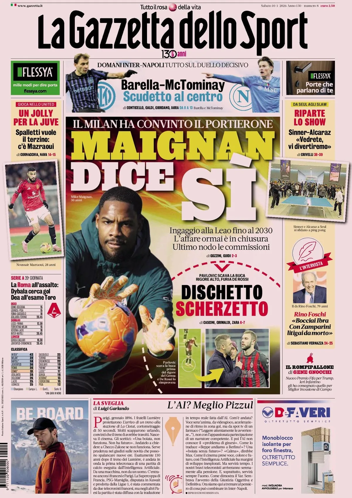 GAZZETTA DELLO SPORT – La Gazzetta dello Sport torna sul gesto di Pavlovic di scavare il dischetto del calcio di rigore prima della battuta di Stanciu e lo fa analizzando i due punti di vista. In casa Milan si parla di una cosa “di campo”, in casa rossoblù il più indispettito già a fine gara è stato De Rossi, che ha avuto un confronto immediato con Pavlovic. In ogni caso, la prova tv non potrà essere utilizzata per questo gesto, come spiega il quotidiano in rosa. “Le immagini televisive possono essere utilizzate in caso di condotta violenta non rilevata da arbitri o VAR o per l’uso di espressioni blasfeme allo stesso modo non riportate da arbitri e aiutanti” scrive il giornale sportivo. Fronte mercato, si legge: “Genoa, valzer in porta. Bento è a un passo, Leali gli cede il posto“.