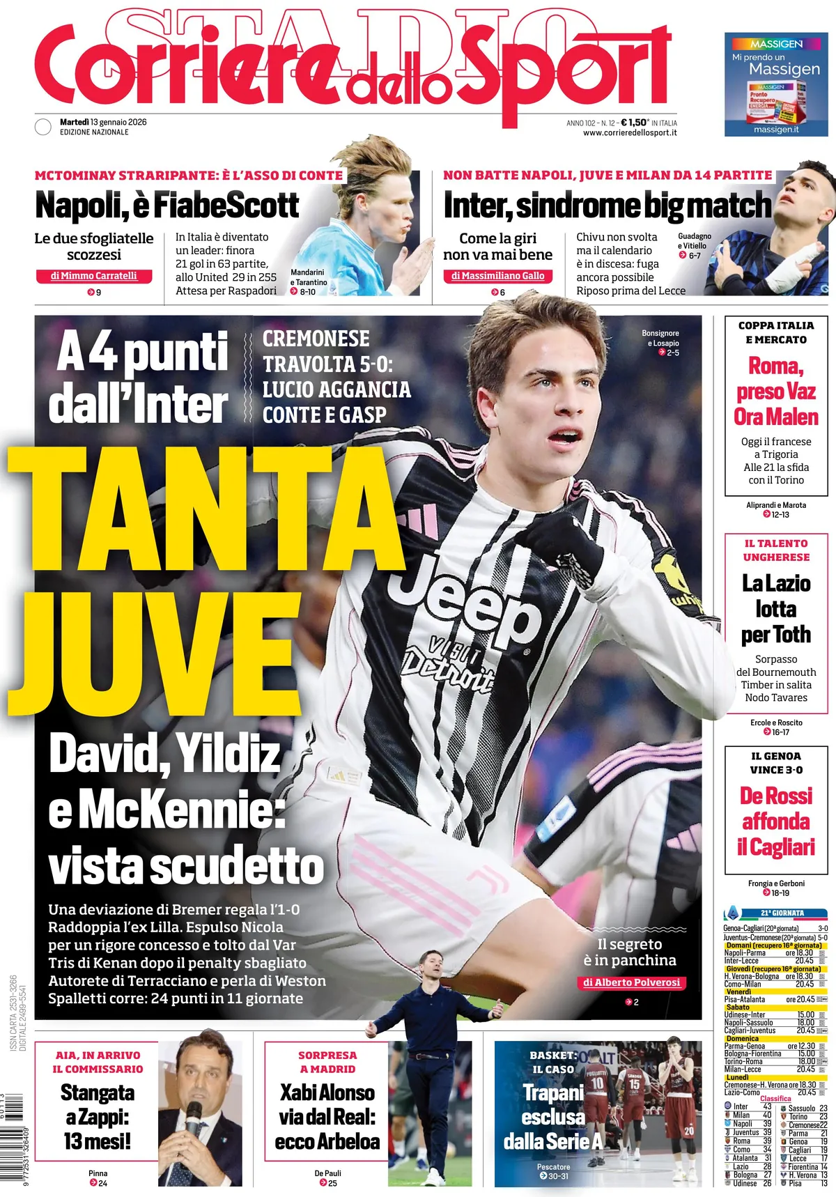 GAZZETTA DELLO SPORT – “Salto triplo, Genoa in volo” titola la Gazzetta dello Sport, che aggiunge: “Colombo scatenato. De Rossi ora sorride. Cagliari, che botta“. La cronaca della gara sottolinea il ritorno alla vittoria dopo un mese e mezzo per il Grifone, che nel 2026 ha già messo assieme cinque punti in tre partite.