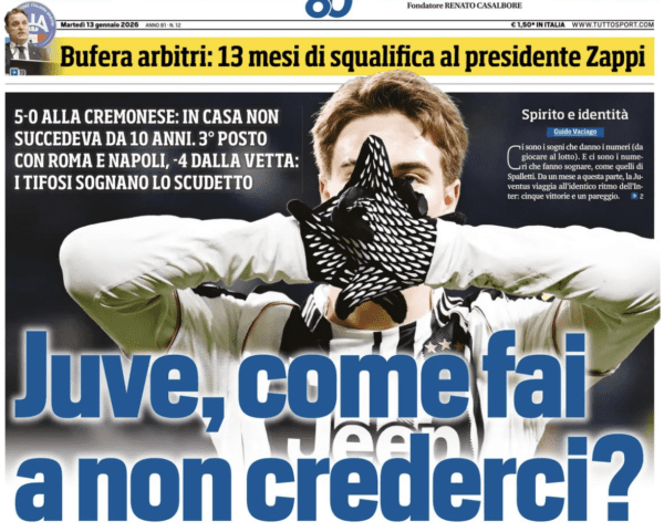 TUTTOSPORT – “Il Genoa va con Colombo superstar” titola stamattina Tuttosport nell’ultima delle analisi sulla sfida tra Grifone e Cagliari. “Terza rete di fila della punta. In gol pure Frendrup e Østigard. De Rossi: “Ma bisogna crescere” aggiunge il quotidiano sportivo. Quotidiano sportivo che segnala anche il blocco da parte dell’Al Nassr di non lasciare partire Bento, almeno per il momento, a causa di un rosso (e di una più che probabile lunga squalifica) rimediato dal portiere titolare Al Aqidi (clicca QUI per saperne di più).