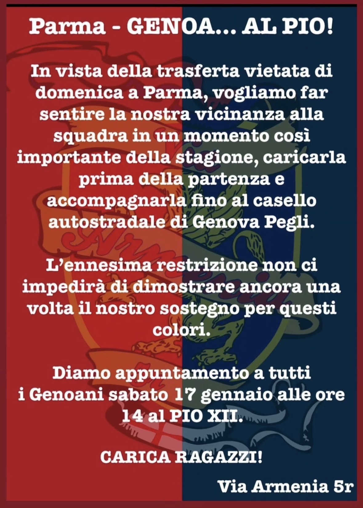 In vista della trasferta vietata di domenica a Parma, vogliamo far sentire la nostra vicinanza alla squadra in un momento cosi importante della stagione, caricarla prima della partenza e accompagnarla fino al casello autostradale di Genova Pegli.