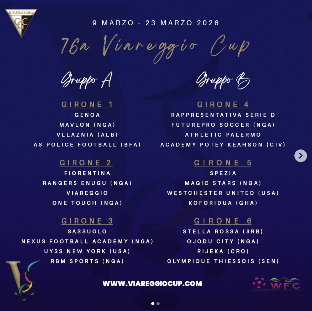 Il Genoa Under 18 di mister Moretti, la medesima formazione classe 2008 ad aver vinto la Super Viareggio Cup, sarà nel Girone 1 con Mavlon (Nigeria), AS Police Football (Burkina Faso) e Vllaznia (Albania). Proprio la squadra albanese è quella con la quale i rossoblù, nel dicembre 2025, si erano giocati la prima edizione della Super Viareggio Cup. Di seguito il dettaglio degli altri gironi, in attesa del calendario.