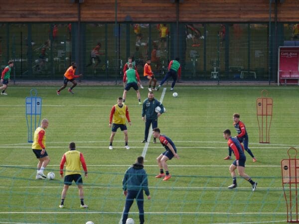 IL RESOCONTO DELLA SEDUTA | L’allenamento è iniziato alle ore 14. Dopo un saluto ai tifosi e un iniziale riscaldamento, primi dieci minuti con esercizi di forza a coppie. Poi i giocatori rossoblù si sono divisi in 4 gruppi per dei torelli in movimento in cinquanta metri, con i due giocatori che sbagliano il passaggio che passano in un altro gruppo.